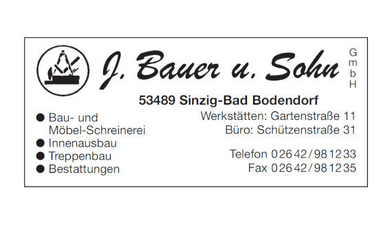 – Bau- und Möbelschreinerei – Innenausbau – Treppenbau – Bestattungen – Überführungen und Erledigung aller Formalitäten Werkstätten: Gartenstr. 11 Büro: Schützenstr. 31 Bad Bodendorf 53489 Sinzig Tel. 0 26 42 / 98 12 33 Fax: 0 26 42 / 98 12 35 Mobil: 0176 – 22 38 86 28