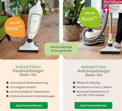 Damit das Putzen einfach.schnell.erledigt ist, haben wir jetzt unsere Lieblingsprodukte für Sie im Aktionspreis. Entdecken Sie entweder den unschlagbar handlichen Kobold VK200 Handstaubsauger oder den effizienten und vielseitigen Kobold VT300 Bodenstaubsauger. ** Und für alle, die jetzt für mehr Durchblick sorgen möchten, gibt es den Kobold VG100 Fensterreiniger bis zum 19.04.2020 für nur 199 €.