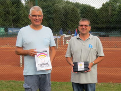 Das Foto zeigt den Vorsitzenden des TC Bad Bodendorf Ralf Barnekow (links) und Karl Hanenberg (rechts) bei der Übergabe eines der Geräte.