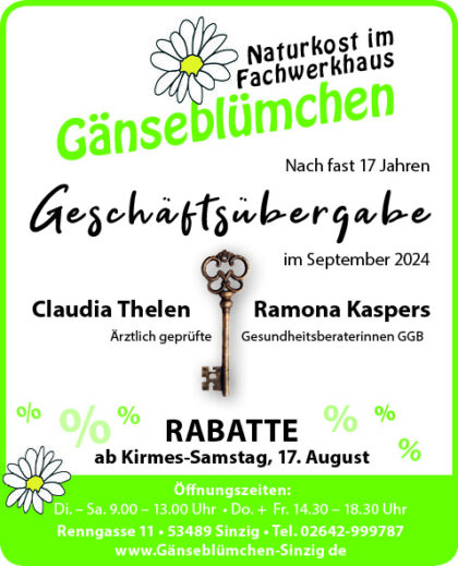 Mit einem lachenden und einem weinenden Auge steht nun die Geschäftsübergabe zum 1.September an. Die bisherige Mitarbeiterin Ramona Kaspers wird das Gänseblümchen in gewohnter Manier und mit neuen Ideen weiterführen.