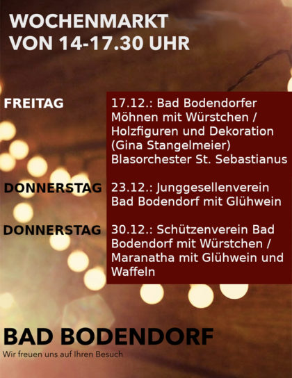 Außerdem gibt es an allen Markt-Tagen im Dezember verschiedene zusätzliche Angebote von örtlichen Vereinen, die den Freitagsmarkt als Ersatz für den ausgefallenen Weihnachtsmarkt nutzen und weitere Attraktionen bieten: 17.12.: Bad Bodendorfer Möhnen mit Würstchen sowie Holzfiguren und Dekoration von Gina Stangelmeier / 23.12.: Junggesellenverein Bad Bodendorf mit Glühwein / 30.12.: Schützenverein Bad Bodendorf mit Würstchen / Maranatha mit Glühwein und Waffeln